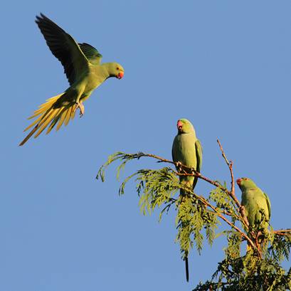 De Halsbandparkiet is een betrekkelijke nieuwkomer in onze regio. Omdat hij door hulp van de mens hier is gekomen, noemen we de soort een exoot. Ondanks koude winters redden ze het hier goed. De populatie wordt gevolgd door in de winter de slaapplaatsen te tellen. Ook andere waarnemingen zijn welkom. Die kunnen via waarneming.nl doorgegeven worden.